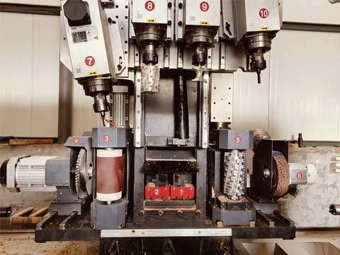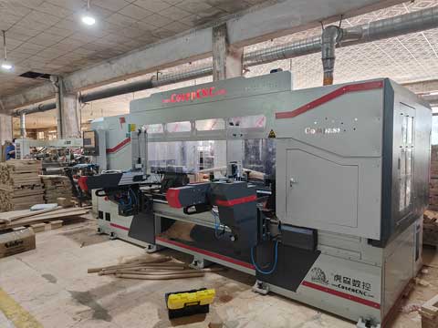 設(shè)備特點(diǎn):這是一款四軸10工序車銑復(fù)合加工中心,可實(shí)現(xiàn)自動(dòng)上料、雙刀車木、立柱刨銑、圓砂打磨、鋸片大吃刀量切削、四工序主軸(可實(shí)現(xiàn)打孔、倒角、拉線、榫槽、榫孔、鏤空、雕刻等功能,兩側(cè)主軸電機(jī)可手動(dòng)調(diào)整角度實(shí)現(xiàn)15度以內(nèi)斜孔加工),此型號(hào)設(shè)備功能更多,配置更齊全,適合加工更加復(fù)雜的工件,如臺(tái)球桌腿、異形復(fù)雜實(shí)木家具工件、實(shí)木家具腿等一次成型。
